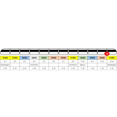 New Item 2021: Set of 2 add-on cars for the DB AG Ep. VI PIKO ICE 4. In 2011, Deutsche Bahn AG commissioned Siemens Mobility to build up to 300 new high-speed trains for use in Germany, Austria and Switzerland. The new BR 412/812 multiple units, which are being jointly developed by Siemens and Bombardier, are powered by several cars, so-called Powercars. The train configuration provides for various modular units ranging from five-car to 14-car trains. This concept allows the train to be This concept allows the train to be easily adapted to the individual specifications of the transport companies in terms of the desired acceleration, speed and number of seats. DB has so far has ordered 85 twelve-car and 45 seven-car multiple units as a basic configuration, consisting of non-powered end and control cars, powered seating cars and on-board bistro as well as non-powered seating, dining and service cars. seating, dining and service cars. The seven-car multiple unit train has three powered carriages and offers 456 seats over a length of 200 meters. A twelve-car multiple unit has six powered carriages and 830 seats over a length of 346 meters. The maximum speed is 250 km/h. The external shape was based on the existing ICE fleet and further developed. The first trains have been in regular service on the Hamburg-Würzburg, Stuttgart-Munich and Hamburg-Berlin-Munich lines since December 2017.
