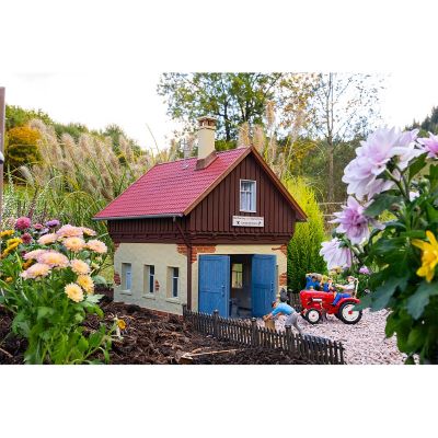 The village smithy impresses with its construction: Solid brickwork on the first floor meets a wood-clad gable area and a classic gabled roof with red tiles. Measuring 333 x 326 x 390 mm, this building is a striking highlight on any G-gauge layout - ideal for rural or historical scenarios.