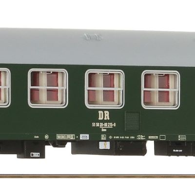 The carriages in the set impress with their true-to-original green color scheme, which corresponds exactly to the original vehicles of the Deutsche Reichsbahn. Extra plug-in parts such as door handles, roof ventilators and other components ensure a realistic appearance. The detailed interior offers additional options for individual design and can be perfectly staged with retrofittable interior lighting.