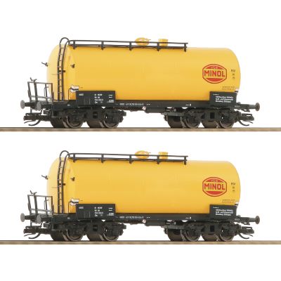 The 2-piece set with tank cars, class ZZw, of the German State Railroad, in Era IV contains two 4-axle tank cars. The cars are equipped with a decorative brakeman's platform and are of the Uerdingen type with Minol lettering. Both cars have different car numbers.