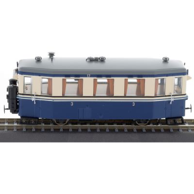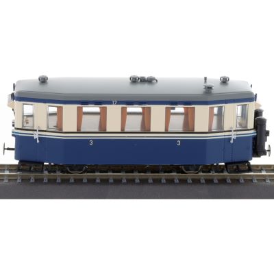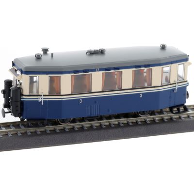 About the original: In 1923, Deutsche Werke Kiel built a series of railcars for the 1000 mm gauge, one of which was the T7. From its first owner, the Finthen-Wackernheim transport company, the railcar passed into the possession of the Süddeutsche Eisenbahn-Gesellschaft in 1928, where it was unsuitable for the track conditions. In 1934, the railcar was fitted with a 110 hp engine and returned to regular service for the Mindener Kreisbahnen. During the Second World War and for some time afterwards, the railcar was rarely used due to fuel shortages. Since the meter gauge era ended on the Mindener Kreisbahn, the motor of the railcar was removed in 1956 and it continued to be used as sidecar 565 until it was finally scrapped in 1963.