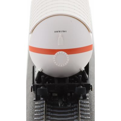 The Zakks gas tank car is a BASF design and is from Era VI. It has a coupler pocket and close coupler kinematics.