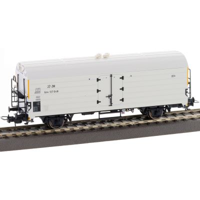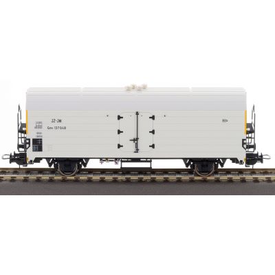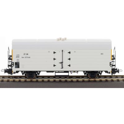 The Gmv refrigerator car is of the JZ design and is from Era III. It is 136 mm long and has a coupler pocket and close coupler kinematics.