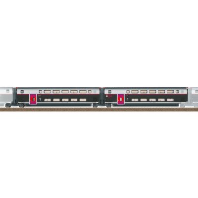 The set contains two 1st class double-decker middle coaches permanently coupled together with LED interior lighting fitted as standard. The interior lighting is powered by the continuous electrical connection of the entire train. The cars are equipped with guide rails in the Jakobs bogies, which guarantees realistic driving behavior even on curves.