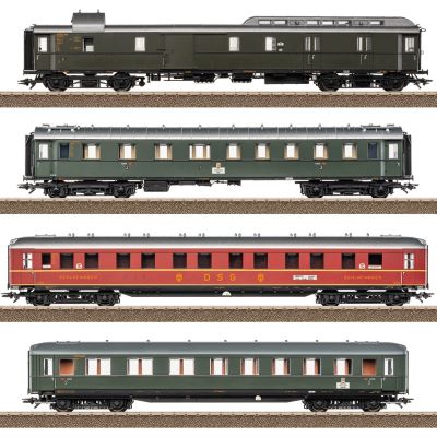 The Trix 23651 Express Train Car Set 1 brings four authentically reproduced cars from the legendary D 74 Hamburg Altona - Basel SBB express train to your H0 layout. The set shows the train running on the Frankfurt - Basel section in operating condition around 1955. It combines German Federal Railroad (DB) cars with a sleeping car from the German Sleeping Car and Dining Car Company (DSG) - a perfect match for Era III and the class 01.10 steam locomotive with a new boiler.