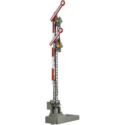 Viessmann presents the Digital Form main signal with filigree brass lattice mast in true-to-the-original paint scheme, printed signal wings, powerful and low-noise motor drive, and integrated multiprotocol digital decoder for DCC and MM. This provides for particularly prototypical wing movement. Even the bobbing of the signal wings can be adjusted individually. In the delivery state, a slight bobbing is already set. The compact, only 5 mm high overhead drive is housed including decoder at the mast base of the signal.
