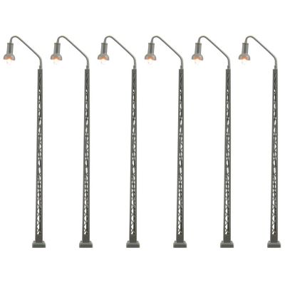 The train depot lights are equipped with warm white LEDs and have a prototypical brass mast with a sturdy patent base. The masts are 8 cm high. Included are 6 masts for the price of 5.